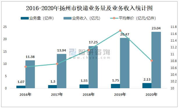 根據各省市郵政局數據可知:2021年7月揚州市快遞業務量為2558.4萬件,業務收入為23398.5萬元;2021年1-7月揚州市快遞累計業務量為16078.7萬件,同比增長61.2%,累計業務收入為157376.5萬元,同比增長34.8%;2016-2020年揚州市快遞業務量與業務收入均逐年遞增,平均單價2019年達到最大值,次年大幅度下滑。
