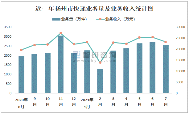 2021年7月揚州市快遞業務量與業務收入分別為2558.4萬件和23398.5萬元
