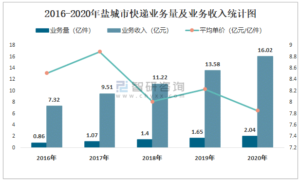 2016-2020年鹽城市快遞業(yè)務(wù)量及業(yè)務(wù)收入統(tǒng)計圖