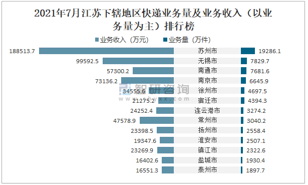 2021年7月江蘇下轄地區(qū)快遞業(yè)務(wù)量及業(yè)務(wù)收入(以業(yè)務(wù)量為主)排行榜