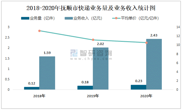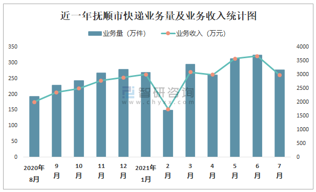 近一年撫順市快遞業務量及業務收入統計圖