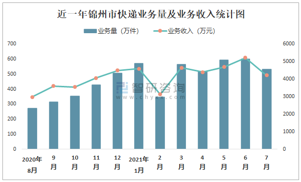 近一年錦州市快遞業(yè)務(wù)量及業(yè)務(wù)收入統(tǒng)計(jì)圖