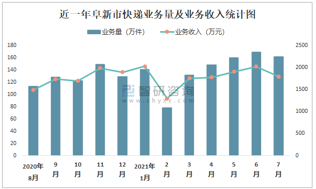 近一年阜新市快遞業(yè)務(wù)量及業(yè)務(wù)收入統(tǒng)計(jì)圖