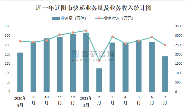 近一年遼陽市快遞業(yè)務(wù)量及業(yè)務(wù)收入統(tǒng)計圖