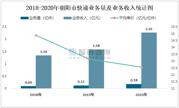 2018-2020年朝陽市快遞業務量及業務收入統計圖