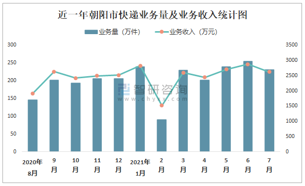 2021年7月朝陽市快遞業務量與業務收入分別為230.94萬件和2625.68萬元