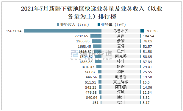 2021年7月新疆下轄地區快遞業務量及業務收入(以業務量為主)排行榜