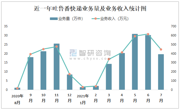 近一年吐魯番快遞業務量及業務收入統計圖