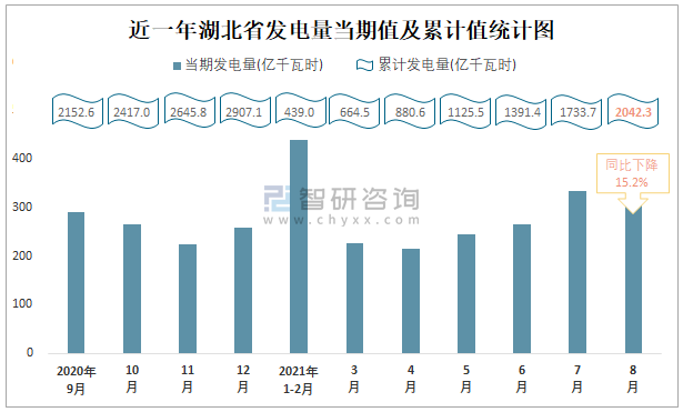 2021年1-8月湖北省發電量為2042.3億千瓦時 以火力發電量為主(占比47.92%)