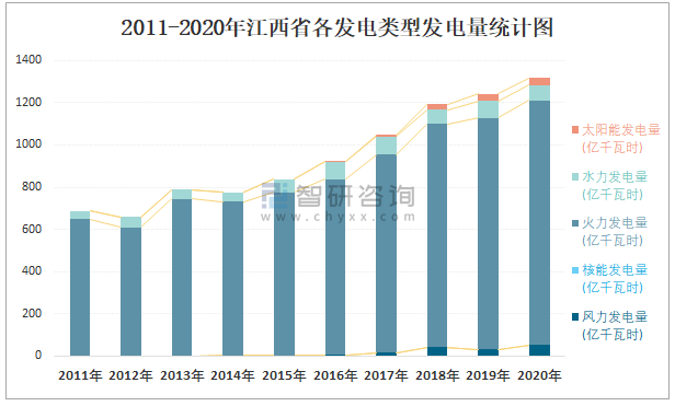 根據國家統計局數據統計可知:2011-2020年江西省發電量有所波動,總體呈現上升趨勢,從發電量類型來看,火力發電量占比最大(2020年占比為87.87%),且近10年有所波動,總體呈現上升趨勢;2011-2020年江西省電力消費量(實物量)逐年遞增,2017年-2018年之間增幅最大,為10.42%,2020年江西省電力消費量(實物量)達到1627億千瓦時。