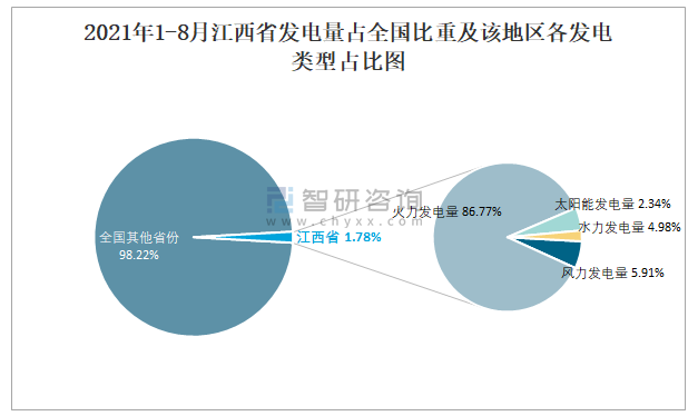 2021年1-8月江西省發電量占全國比重及該地區各發電類型占比圖