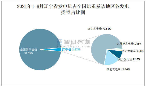 2021年1-8月遼寧省發電量占全國比重及該地區各發電類型占比圖