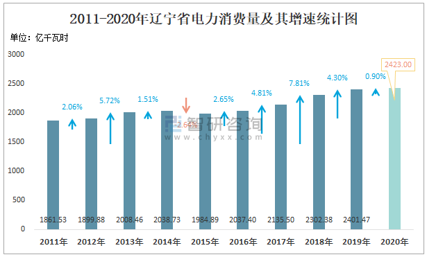 2011-2020年遼寧省電力消費量及其增速統計圖