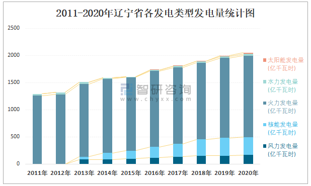 2011-2020年遼寧省各發電類型發電量統計圖