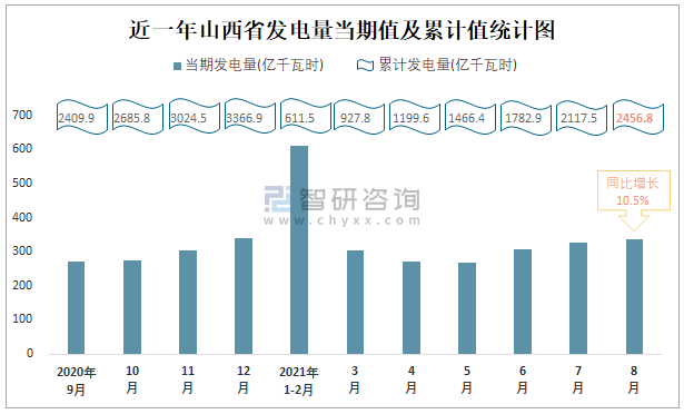 近一年山西省發(fā)電量當(dāng)期值及累計(jì)值統(tǒng)計(jì)圖