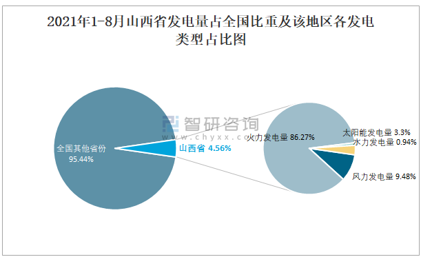 2021年1-8月山西省發(fā)電量占全國比重及該地區(qū)各發(fā)電類型占比圖