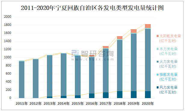2011-2020年寧夏回族自治區各發電類型發電量統計圖