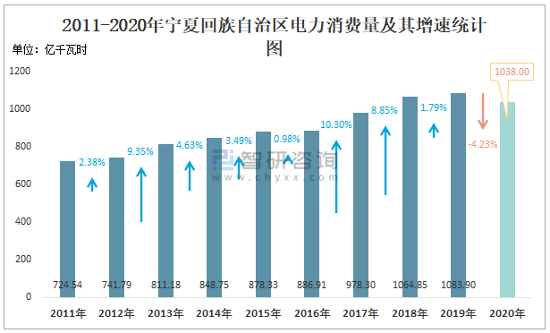 2011-2020年寧夏回族自治區電力消費量及其增速統計圖