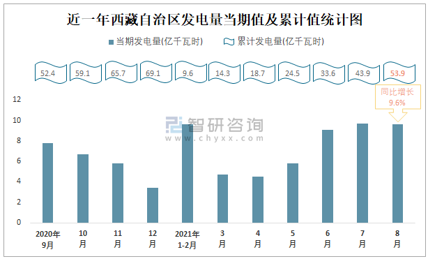 近一年西藏自治區(qū)發(fā)電量當(dāng)期值及累計(jì)值統(tǒng)計(jì)圖