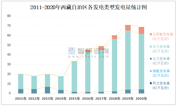 2011-2020年西藏自治區(qū)各發(fā)電類型發(fā)電量統(tǒng)計(jì)圖