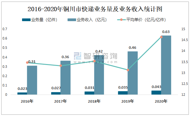 2016-2020年銅川市快遞業務量及業務收入統計圖