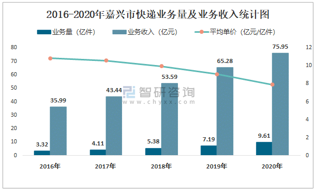 2016-2020年嘉興市快遞業務量及業務收入統計圖