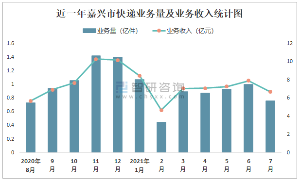 2021年7月嘉興市快遞業務量與業務收入分別為7581.7萬件和66892.8萬元