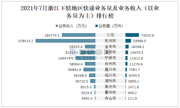 2021年7月浙江下轄地區快遞業務量及業務收入(以業務量為主)排行榜