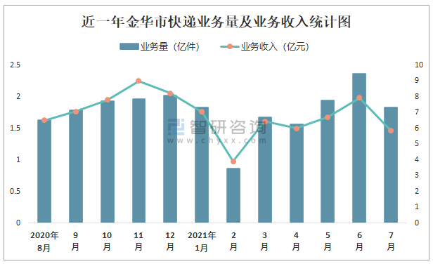 近一年金華市快遞業務量及業務收入統計圖