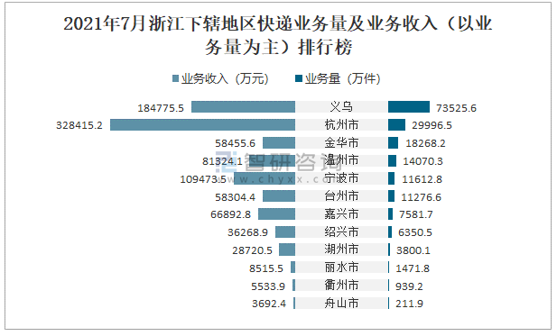 2021年7月浙江下轄地區快遞業務量及業務收入(以業務量為主)排行榜