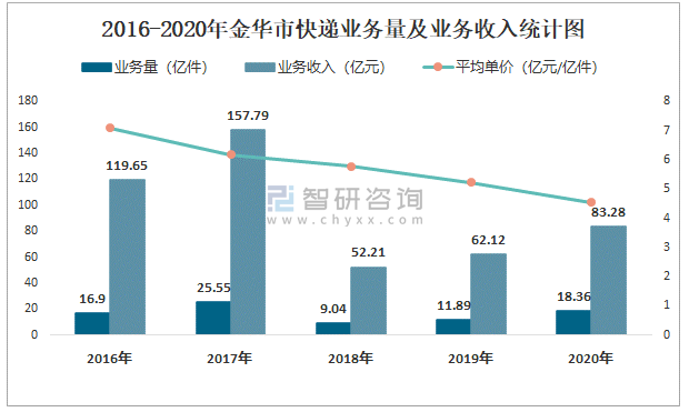 2016-2020年金華市快遞業務量及業務收入統計圖
