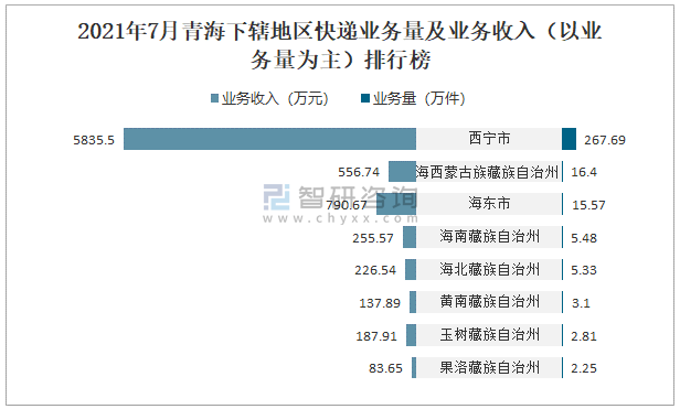 2021年7月青海下轄地區(qū)快遞業(yè)務(wù)量及業(yè)務(wù)收入(以業(yè)務(wù)量為主)排行榜