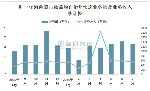 近一年海西蒙古族藏族自治州快遞業(yè)務(wù)量及業(yè)務(wù)收入統(tǒng)計(jì)圖
