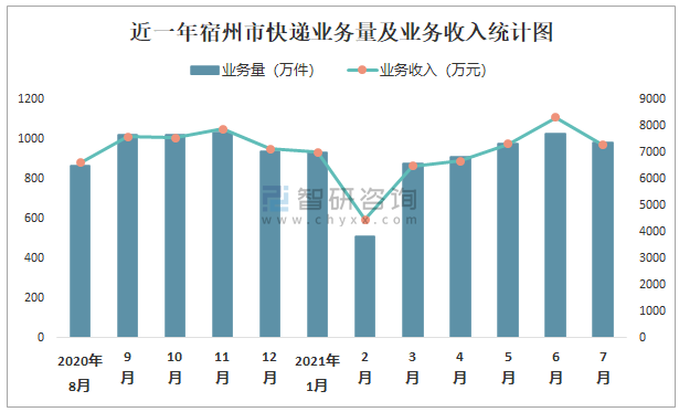 近一年宿州市快遞業務量及業務收入統計圖