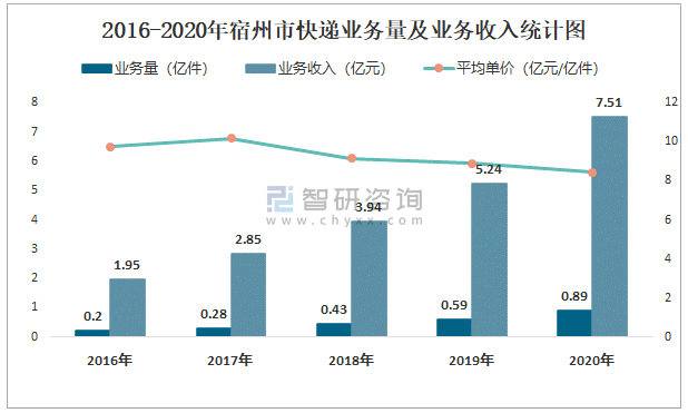 2016-2020年宿州市快遞業務量及業務收入統計圖