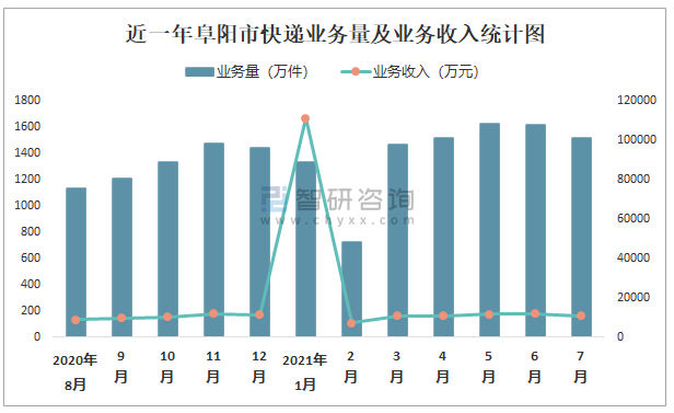 近一年阜陽市快遞業(yè)務量及業(yè)務收入統(tǒng)計圖