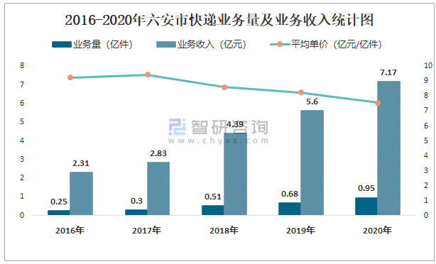 2016-2020年六安市快遞業務量及業務收入統計圖