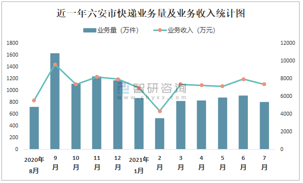近一年六安市快遞業務量及業務收入統計圖