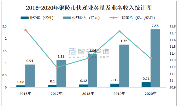 根據(jù)各省市郵政局?jǐn)?shù)據(jù)可知:2021年7月銅陵市快遞業(yè)務(wù)量為252.44萬(wàn)件,業(yè)務(wù)收入為2192.92萬(wàn)元;2021年1-7月銅陵市快遞累計(jì)業(yè)務(wù)量為1622.8萬(wàn)件,同比增長(zhǎng)54.05%,累計(jì)業(yè)務(wù)收入為15531.71萬(wàn)元,同比增長(zhǎng)28.38%;2016-2020年銅陵市快遞業(yè)務(wù)量與業(yè)務(wù)收入均逐年遞增,平均單價(jià)存在一定幅度的波動(dòng)。