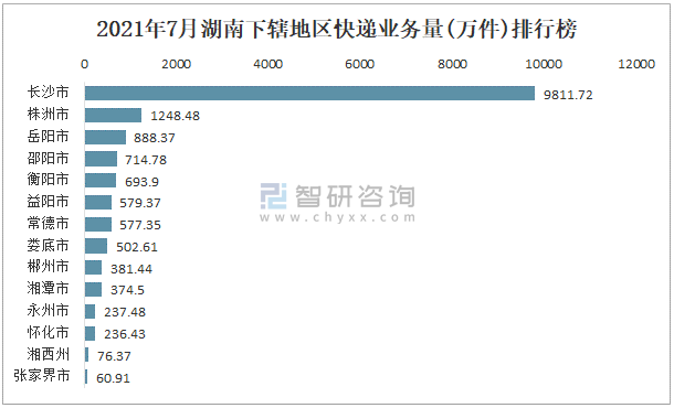 根據各省市郵政局數據可知:2021年1-7月快遞業務量主要集中在華東、華南、華中地區;2021年1-7月快遞業務量地區分布不均勻,其中華東地區占比最大,特別是浙江省貢獻了最多業務量;2021年7月湖南下轄地區快遞業務量排行榜中,張家界市快遞業務量排名最后。