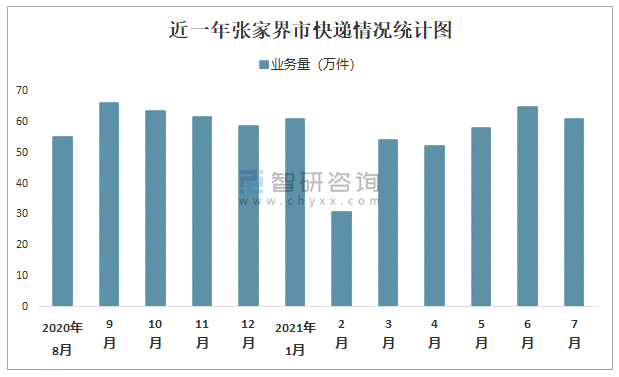 根據各省市郵政局數據可知:2021年7月張家界市快遞業務量為60.91萬件;2021年1-7月張家界市快遞累計業務量為381.98萬件,同比增長27.52%。