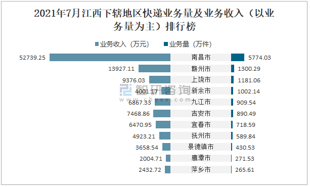 2021年7月江西下轄地區(qū)快遞業(yè)務(wù)量及業(yè)務(wù)收入(以業(yè)務(wù)量為主)排行榜