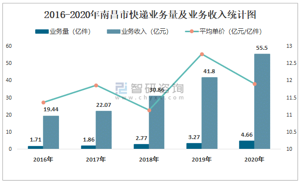 2016-2020年南昌市快遞業(yè)務(wù)量及業(yè)務(wù)收入統(tǒng)計圖