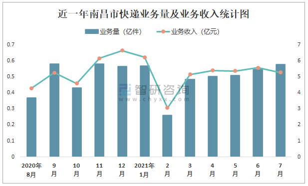 近一年南昌市快遞業(yè)務(wù)量及業(yè)務(wù)收入統(tǒng)計圖