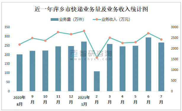 近一年萍鄉(xiāng)市快遞業(yè)務(wù)量及業(yè)務(wù)收入統(tǒng)計(jì)圖
