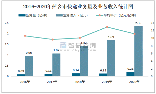 2016-2020年萍鄉(xiāng)市快遞業(yè)務(wù)量及業(yè)務(wù)收入統(tǒng)計(jì)圖