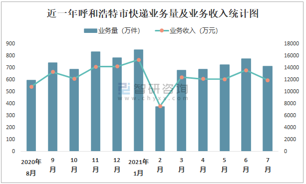 近一年呼和浩特市快遞業務量及業務收入統計圖