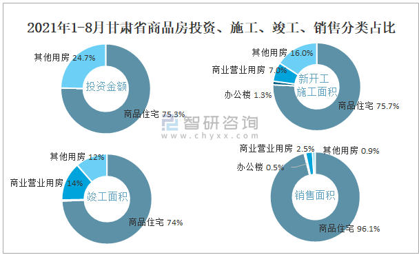 2021年1-8月甘肅省商品房投資、施工、竣工、銷售分類占比