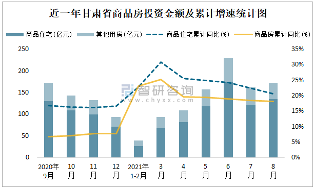 根據國家統計局數據統計可知:2021年8月甘肅省房地產開發投資商品房投資金額為172.15億元(其中商品住宅為134.4億元,辦公樓、商業營業用房等其他用房37.75億元);2021年1-8月甘肅省房地產開發投資商品房累計投資金額為961.77億元,投資金額累計同比增長18.2%。