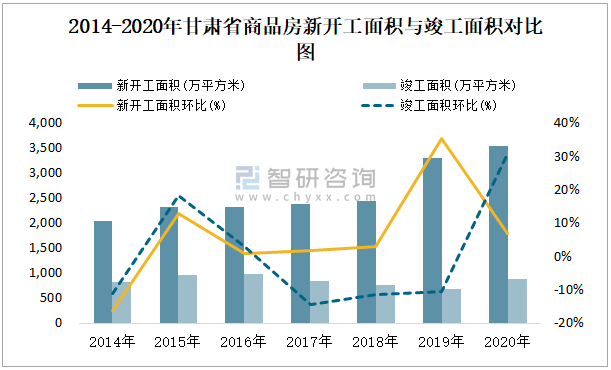 2014-2020年甘肅省商品房新開工面積與竣工面積對比圖